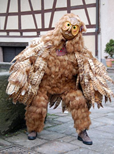 Eine handgeschnitzte Holzlarve aus der Werkstatt des Elzacher Maskenschnitzers Franz Lang, komplettiert das aufwendige Eulenhäs.
